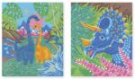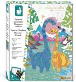 Au fur et à mesure qu’il appliquera les couleurs, se dévoilera sous ses yeux un beau décor verdoyant sur le thème des dinosaures : sur le premier tableau, un couple de deux diplodocus, les plus grands des dinosaures à la taille impressionnante et au cou interminable, profite paisiblement d’une journée ensoleillée; sur le second, un triceratops au regard affûté semble se cacher au milieu de la végétation luxuriante… un véritable retour dans le temps ! L’un des deux tableaux comprend des effets de dorure, pour un résultat encore plus captivant.