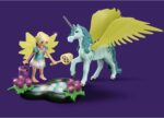 Il va y avoir de la magie dans l’univers Playmobil ! La Crystal Fairy et son animal totem , une licorne de cristal, sont parties en promenade, elles en profitent pour ramasser des cristaux dans un petit étang. Elle pourra les ramener à la source d’énergie enchantée lorsqu’elle aura terminé. Mais attention ! … La Crystal Fairy avec sa licorne doit se méfier des mystérieuses Bat Fairies : elles sont à la recherche des cristaux d’énergie pour les cacher dans leur sombre ruine…