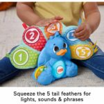Bébé peut presser les 5 boutons plumes de la queue du paon ou tourner la roue de couleur pour apprendre les formes, la politesse, les chiffres et à compter de 1 à 5