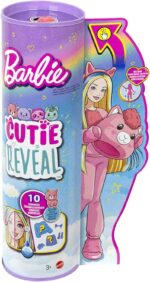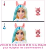 Les poupées Barbie Cutie Reveal Série Fantasy font de la découverte du jouet une expérience adorable. Le coffret comprend 10 surprises, dont une poupée Barbie articulée ! Ouvrez l’emballage pour découvrir un lama tout doux et quatre sachets-surprises. Retirez le costume de lama aux couleurs de fête pour dévoiler une poupée Barbie aux cheveux longs et détails scintillants. Ouvrez les sachets-surprises, qui contiennent des vêtements et des accessoires scintillants, un peigne-éponge et un mini-lama. Les enfants peuvent habiller et accessoiriser la poupée Barbie : le haut du costume est réversible et se transforme en veste en polaire toute douce tandis que la tête du costume devient un petit lit pour animal ! Les surprises adorables ne s’arrêtent pas là : certains éléments peuvent changer de couleur. Un maquillage animalier apparaît sur le visage de Barbie et son lama « ouvre et ferme » les yeux. Il est tellement mignon ! Prenez le peigne-éponge et appliquez de l’eau froide pour commencer la transformation. Utilisez de l’eau chaude pour retrouver les couleurs initiales. Découvrez toutes les surprises mignonnes de cette collection Barbie Cutie Reveal. Contient une poupée avec son costume animal et 10 surprises. La poupée ne tient pas debout toute seule. Les couleurs et les décorations peuvent varier.