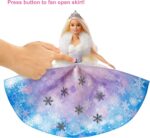 Appuyez sur le bouton: la magie opère !La longue robe évasée de la princesse Barbie révèle les flocons de neige argentés et de jolis tons lavande, bleu et rose. Repliez la jupe et recommencez…. | Ces détails magiques lui confèrent un statut royal !Une mèche rose vient rehausser sa longue chevelure blonde, tandis qu’un faux col en fourrure scintillante complète son fantastique look de princesse. | Les accessoires prolongent l’aventure !Le diadème amovible et la brosse à cheveux permettent aux enfants d’apprêter Barbie pour sa prochaine réception royale. |