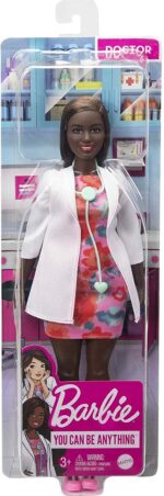 - Vêtue d’une robe à motifs colorés protégée par une blouse blanche, la poupée Barbie Docteur (30,40 cm) est prête à prendre en charge ses patients.