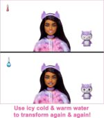 Retournez le haut du costume pour en faire une veste en polaire ultra douce pour la poupée Barbie Cutie Reveal, avec un adorable imprimé à la mode. Les poupées Barbie Cutie Reveal sont articulées au niveau des genoux, des hanches et des coudes pour une multitude de possibilités ! | Certains éléments changent de couleur : appliquez de l’eau froide sur le visage de Barbie pour découvrir un maquillage d’hiver pailleté, et sur le visage de l’animal pour ouvrir et fermer ses yeux. Utilisez de l’eau chaude pour retrouver les couleurs initiales. Répétez à l’infini ! | La tête du costume se transforme en panière toute douce dans laquelle la mini-figurine animale pourra se blottir et se reposer. Comme c’est mignon ! |