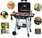 Barbecue avec un côté grill, et un côté plancha. 18 accessoires inclus : hamburger à assembler, brochette à composer, pince, allume gaz,. Système magique de flammes rétractables.