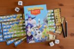Kingdomino Duel est un jeu de dés dans lequel chaque joueur constitue un domino à son tour de jeu en associant 2 dés sélectionnés et le dessine sur sa carte. A chaque tour, le premier jour choisira 1 dé en premier et 1 dé en dernier. Les zones créées vont marquer des points de la même façon que dans le jeu d’origine. Les joueurs vont également disputer une course aux pouvoirs auprès des mages dans le grimoire central.