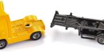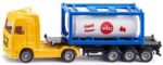 Les matières premières liquides et les gaz sont commercialisés, traités et transportés dans des conteneurs- citernes dans le monde entier. Par cargo, rail ou route. Le conteneur sur la semi- remorque à 3 essieux est monté dans un châssis et peut être déchargé et empilé comme l’original (le conteneur ne peut être rempli). En combinaison avec de nombreux autres modèles de jouets de la même échelle, de nouvelles situations de jeu peuvent toujours être créées. Cela permet non seulement de s’amuser longtemps, mais aussi d’encourager la créativité des enfants, car il n’y a pas de limites aux combinaisons possibles.