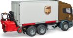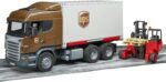 La cabine de ce camion de transport Scania r-série offre la possibilité d’ouvrir les portes, pour y installer un conducteur. La partie arrière de la camionnette dispose d’une porte latérale ouvrante, les deux portes arrières peuvent également être ouvertes à 360°. le container est amovible et possède des béquilles de support latérales. Inclus: un tire palette et deux palettes.