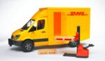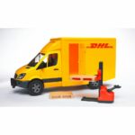 Camion de transport DHL jaune avec un transpalette et accessoires