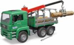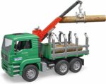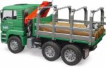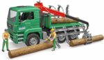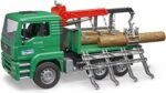 Le camion de transport de bois MAN avec grue de chargement et trois troncs d’arbre, de la société bruder, fait briller les yeux des enfants