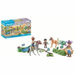 Démarrez la compétition avec votre poney dans le Tournoi de Poneys PLAYMOBIL. Le terrain du tournoi comporte divers obstacles tels que des tranchées d’eau, des branches et des bottes de paille pour que les cavaliers puissent montrer leurs compétences. Parcourir le parcours sans faute n’est pas si simple, mais tout le monde donne le meilleur d’eux-mêmes. À la fin, un trophée du vainqueur pour l’enfant et une couronne de laurier pour le poney sont donnés. Mais qu’il soit premier ou deuxième, participer c’est le principal ! Ce set comprend trois personnages PLAYMOBIL, deux poneys, trois haies, un podium, une couronne de victoire, des casques et bien d’autres accessoires. Les figurines d’enfants peuvent monter les poneys sans selle. La nouvelle gamme Horses of Waterfall est fabriquée avec plus de 80% de matériaux recyclés ou biosourcés en moyenne.
