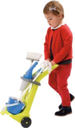 Ce kit réunit un chariot de ménage pour enfants, un aspirateur-traîneau, un balai espagnol, un seau équipé d’une essoreuse, un balai, une pelle, une balayette et 2 flacons de produits ménagers.