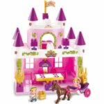 UN CHÂTEAU ENCHANTE : Constitué d’une grande salle de bal avec cheminée, table de banquet et chandeliers et d’une chambre royale à l’ombre des tours. Le roi et la reine sont inclus ainsi que leur calèche et leur cheval.