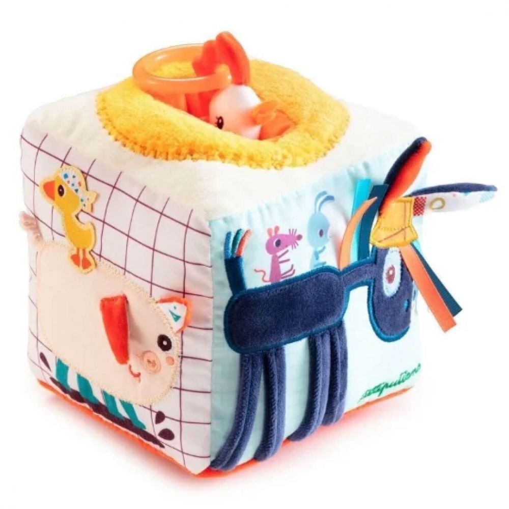 Un cube d’éveil ultra-doux aux motifs de la ferme pour raconter des histoires et découvrir des sons. Anneau de dentition et cris d’animaux inclus. Le cube stimule les sens, l’imagination et la motricité fine des enfants.