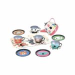 Tous les accessoires sont en métal imprimé.• Une théière musicale dotée en dessous d’une clé pour remonter le mécanisme de la boîte à musique.Quand on penche la théière, la mélodie « joyeux anniversaire » se déclenche.Quand on repose la théière, la mélodie s’arrête automatiquement.• 4 tasses.• 4 soucoupes.• 4 assiettes.• Un plateau.