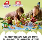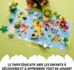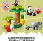 Emmenez votre enfant d’âge préscolaire en voyage autour du monde pour découvrir les créatures qui peuplent les 7 continents avec cette grande boîte en briques LEGO DUPLO Animaux Sauvages du Monde (10975). Ce fantastique ensemble de jeu avec tapis de jeu contient 22 animaux différents dans leurs habitats naturels et regorge de détails authentiques, donnant aux petits de 2 ans et plus l’opportunités d’apprendre par le jeu.Les enfants trouveront un monde d’animaux et de plantes sauvages à construire et à explorer, ils découvriront également des figurines d’animaux comme des pandas en Asie, des lions en Afrique, un cerf en Europe, un alpaga en Amérique du Sud, un koala en Australie, des pingouins en Antarctique… et bien plus encore ! Il y a aussi une brique sonore qui reproduit les sons des jouets animaux et les bruits de l’environnement. Ce jouet éducatif pour enfants de 2 ans et plus comprend également un tapis de jeu reproduisant la carte du monde. Il existe alors des possibilités infinies pour jouer et apprendre avec ce grand ensemble LEGO DUPLO.Ce jouet pour enfants de 2 ans pleins d’animaux permet aux enfants de construire et de jouer avec la faune du monde, en développant des compétences cognitives et l’envie de découvrir de nouveaux endroits. Une excellente idée de cadeau d’anniversaire pour tous les enfants qui aiment la nature et les endroits à explorer qu’ils peuvent partager avec leurs parents.