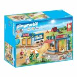 C’est enfin l’été ! Et si on allait au camping ? Avec réception et kiosque. Le bâtiment sanitaire est équipé d’une douche fonctionnelle. Comprend trois personnages et une tente. Dimensions bâtiment d’accueil : 18x17x17 cm (LxPxH) Dimensions bâtiment sanitaire : 28 x 21 x 17 cm (LxPxH).