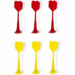 Livré avec 6 fléchettes en plastique (3 jaunes et 3 rouges), qui pourront éventuellement être complétées par des fléchettes vertes et bleues vendues à part (référence Janod : J02078).