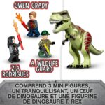 - Comprend les minifigurines Owen Grady, Zia Rodriguez et le gardien d’animaux sauvages avec des accessoires, un œuf de dinosaure, un talkie-walkie et un tranquillisant