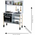 Cette cuisine-jouet Miele en bois de haute qualité contient tout ce dont les petits cuisiniers ont besoin : un four, deux plaques de cuisson – avec bruitage et double fonction d’éclairage – et un micro-ondes. Dans l’élégante marmite en métal munie d’un couvercle ou dans la poêle d’une solidité à toute épreuve, ils pourront concocter des plats délicieux à l’aide d’un.ouet, d’une cuillère et d’une spatule. Aucun problème pour remplir l’évier d’eau ou de vaisselle sale : il est amovible pour être plus facilement nettoyé lors du rangement. Cette cuisine-jouet offre tous les avantages pratiques d’une cuisine ludique bien équipée qui fera la joie de tous les enfants pour de très longs moments, grâce à la qualité exceptionnelle de sa fabrication et de ses accessoires . Cuisine-jouet Miele en bois Cette cuisine en bois blanc contient une plaque de cuisson avec bruitage et double fonction lumineuse, ainsi qu’un four traditionnel, un micro-ondes, un évier amovible et des accessoires de haute qualité en métal et en bois : marmite avec couvercle, poêle, fouet, cuillère de cuisson et spatule. – Dimensions : 70 cm x 30 cm x 91 cm – Convient à des enfants à partir de trois ans – Piles requises : 2 x R6-AA – Non incluses