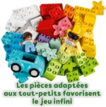 Ce jouet éducatif est rempli de briques et de pièces, le jouet bébé 1 ans et demi encourage à explorer le jeu de construction. Les objets familiers stimulent les jeunes esprits, ce qui fait de cette boîte de briques LEGO DUPLO Classic (10913) le moyen idéal pour susciter la créativité de tout jeune constructeur. À l’intérieur de la boîte de rangement, vous trouverez une voiture avec des roues mobiles, un toit, une fenêtre, des fleurs, du pain, des personnages DUPLO, des briques numérotées 1, 2,3… ainsi qu’un assortiment de briques originales dans un arc-en-ciel de couleurs attrayantes. Les jeux DUPLO LEGO bébé sont des jouets premier âge qui permettent aux jeunes constructeurs de s’exprimer et de jouer infiniment. Avec des pièces colorées et des briques de construction faciles à tenir qui stimulent leur imagination, ils sont sûrs, propres et faciles à emporter partout où vous allez. Contient 65 pièces
