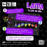 Dans Lama, le jeu de dés, poussez votre chance en relançant les dés pour vous débarraser de vos cartes! Si vous échouez, vos cartes restantes vont vous rapporter des jetons points, le seul moyen de s’en défausser: réaliser un lancer Triple Lama! Le joueur qui a le moins de points remporte la partie.
