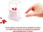 Avant le début de la partie, les bijoux sont placés sur le coffre-fort du musée sous la cloche du coffre-fort. | Les voleurs dérobent les bijoux du coffre-fort du musée pendant que tout le monde a les yeux fermés. | Si les voleurs n’arrivent pas à remettre en place le coffre-fort à temps, les détectives gagnent automatiquement un bijou ! |