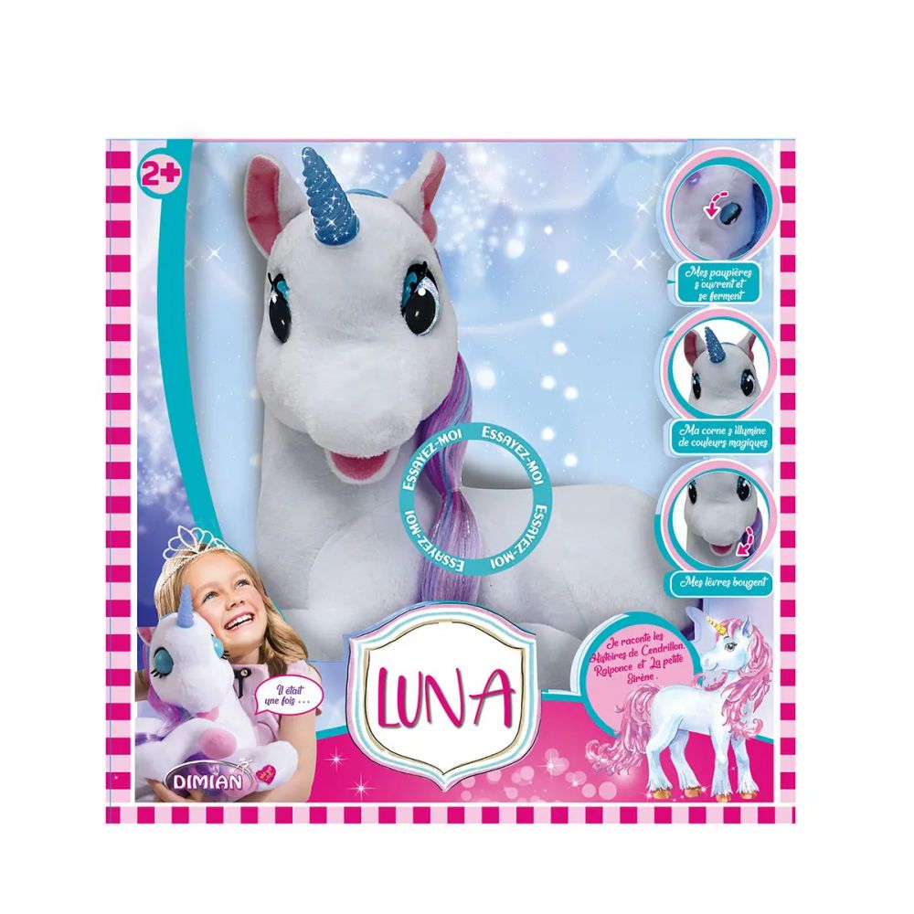 Cette adorable peluche interactive en forme de licorne, prénommée Luna, va devenir la meilleure amie de votre enfant. Luna adore qu’on la serre dans ses bras, et elle est toute heureuse lorsqu’elle raconte des contes de fées aux enfants. Elle connaît par cœur les histoires de Cendrillon, Golden Bees et les Trois Ours qu’elle raconte avec beaucoup de tendresse. Luna cligne des yeux et sa corne brille. Avec leur peluche Luna, les enfants sont transportés dans un monde imaginaire et trouve beaucoup de réconfort.