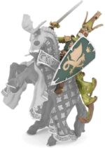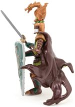Equipé de son armure et de son heaume à cimier, le maître des armes dragon est prêt à partir au combat! Quoi quil en coûte il défendra son royaume contre l’envahisseur et pour cela il sait qu’il peut compter sur son fidèle destrier. Les cors résonnent sur le champ de bataille, la clameur monte parmi les chevaliers, il est temps pour lui de se saisir de son épée et de son bouclier orné d’un dragon.