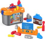 Votre bébé aime imiter les grands ? Alors stimulez son imagination avec ce petit atelier de bricolage, qui contient 36 pièces de jeu, dont 29 gros blocs de construction solides et une carte avec un modèle de petite maison pour oiseaux à construire. La boîte à outils se transforme en petit atelier pour empiler les blocs de construction et enfoncer les 2 clous en plastique à l’aide du marteau. Les enfants peuvent également visser les 2 vis à l’aide de l’écrou en plastique pour fixer la maison au bac. Idéal avec les coffrets First Builders ; à partir de 2 ans