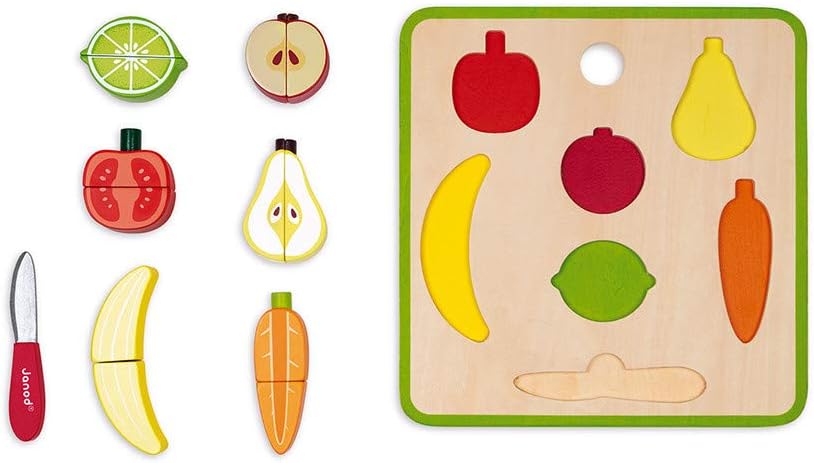 - UN PLATEAU ET PUZZLE 2-EN-1 : Coté recto, vous trouverez la planche à découper pour que l’enfant cuisine et découpe tous les fruits et légumes de ce jouet et s’il le retourne, il trouvera la partie puzzle d’encastrement, Des emplacements pour chaque légume et chaque fruit sont sur le puzzle, l’enfant devra deviner à l’aide des formes l’emplacement de chaque pièce,