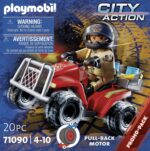 En avant avec les nouveaux quads PLAYMOBIL ! En un clin d’œil, le pompier saute sur son quad et part sur le lieu de l’intervention. Grâce à son quad hyper maniable, mêmes les ruelles étroites ou les terrains accidentés ne posent aucun problème au pompier et il peut se rendre sur les lieux au plus vite pour secourir les habitants. Dans le porte-bagages, il range sa hache, qu’il utilise pour secourir des gens coincés dans une maison ou dans un véhicule. Contient un personnage, un quad avec moteur à rétro-friction et divers accessoires.
