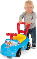 Voiture Pat Patrouille ergonomique. Butées anti-bascule avant et arrière. Coffre à jouets sous le siège.