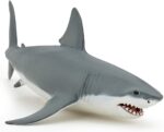 Le grand requin blanc est l’un des plus grands prédateurs marins et connait peu de concurrents. Il doit son nom à la blancheur de son ventre qui contraste fortement avec son dos gris. On le retrouve dans toutes les eaux tempérées du globe, principalement les eaux peu profondes. Il possède une ouïe et un odorat très développés faisant de lui un chasseur redoutable. Il mesure de 4 à 6 mètres de long et possèdent une impressionnante mâchoire munies de dents triangulaires, tranchantes comme des lames de rasoir. Le requin blanc est carnivore et se nourrit essentiellement de grands poissons comme le thon, mais aussi de phoques, de tortues, de dauphins et même d’autres espèces de requins.