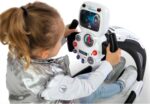 Simulateur de conduite sur le thème de l’espace. Pédales mécaniques, volant électronique avec circuit animé (navette spatiale). Sons et lumières intégrés. 3 piles LR6 non incluses.