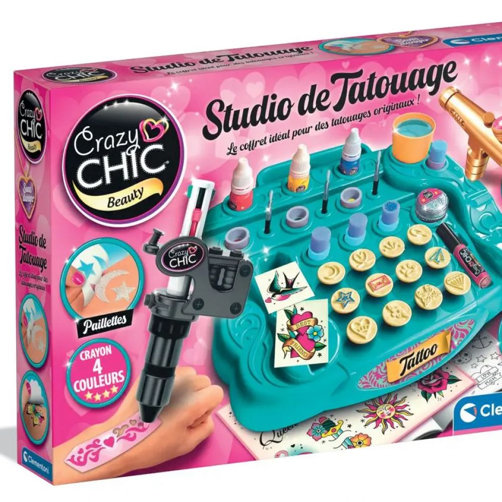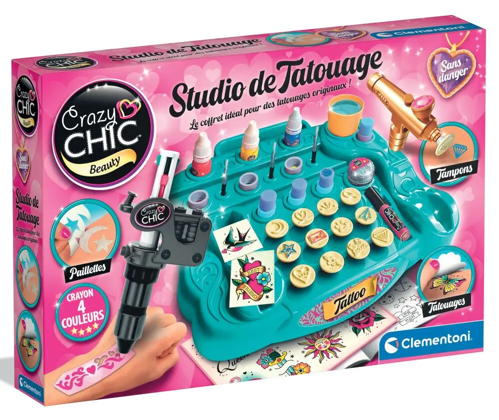 Grâce à la machine à tatouer spéciale pour la peau et ses mines colorées interchangeables, les petites filles pourront s’amuser à créer leurs propres tatouages, en les dessinant à main levée ou à l’aide des pochoirs. • Pratique : une machine-tampon et les différentes encres te permettront de faire facilement des tatouages colorés ! • Contient aussi des tatouages transferts, des peintures pour le corps pour colorier les tatouages, des éponges, des applicateurs, des pochoirs, un livre de dessins et de conseils pour créer ses tatouages !
