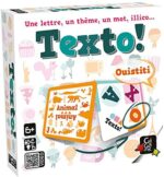- Descriptif du produit: chacun leur tour, les joueurs retournent une carte révélant ainsi une catégorie et trois lettres. Seule l’une d’entre elles correspond à la couleur de la catégorie. Il s’agit alors d’être le plus rapide à trouver un mot qui commence par cette lettre et appartient à cette catégorie: le premier qui y parvient gagne la carte. Puis on recommence un nouveau tour. Celui qui cumule le plus de cartes en fin de partie, gagne. Texto! Est un jeu au principe simple mais totalement addictif qui mettra à l’épreuve votre vivacité d’esprit.
