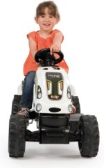 Le capot avant se soulève et le corps du tracteur est décoré pour que l’enfant joue avec le « moteur ». Le volant est équipé d’un klaxon et le siège est réglable sur 3 niveaux.