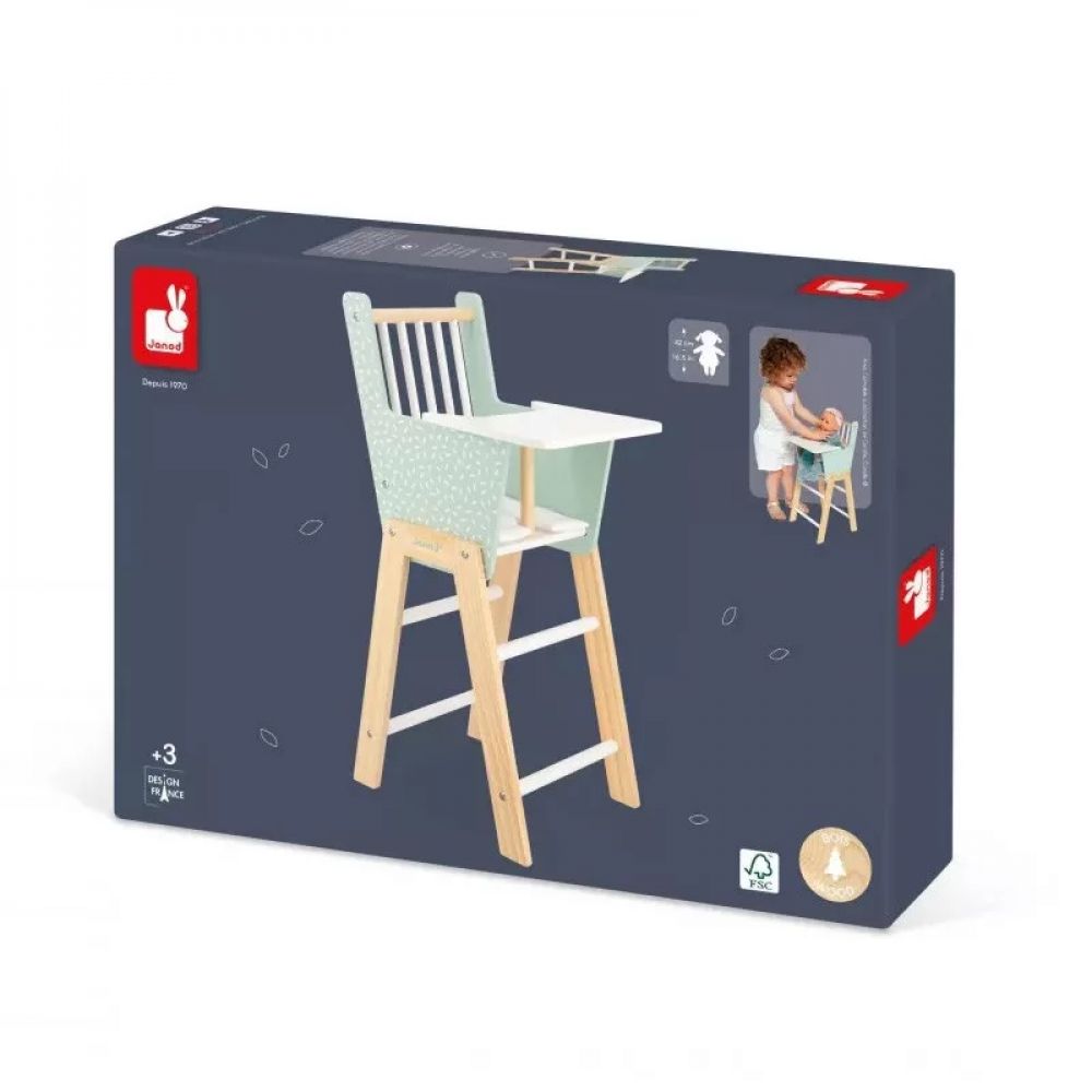 La Chaise Haute Zen verte et blanche en bois, avec un large plateau, convient aux poupons mesurant jusqu’à 42 cm, pour un temps repas agréable. Dès 3 ans.
